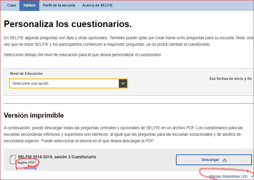 Al pulsar sobre “Personaliza los cuestionarios” podemos descargar en PDF el cuestionario para todos los niveles de Educación. Antes de pulsar “descargar”, podemos elegir el idioma, pulsando en los círculos rojos de la figura anterior.
