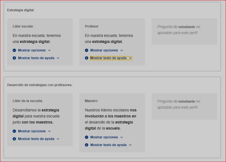 Esta opción no se aplica a los estudiantes. Incluye unas preguntas dirigidas a los líderes escolares y a los profesores, sobre “Estrategia digital”, “Desarrollo de estrategias con profesores”,” Nuevas formas de enseñar”, “Revisión del progreso” y “Discusión sobre el uso de la tecnología”.