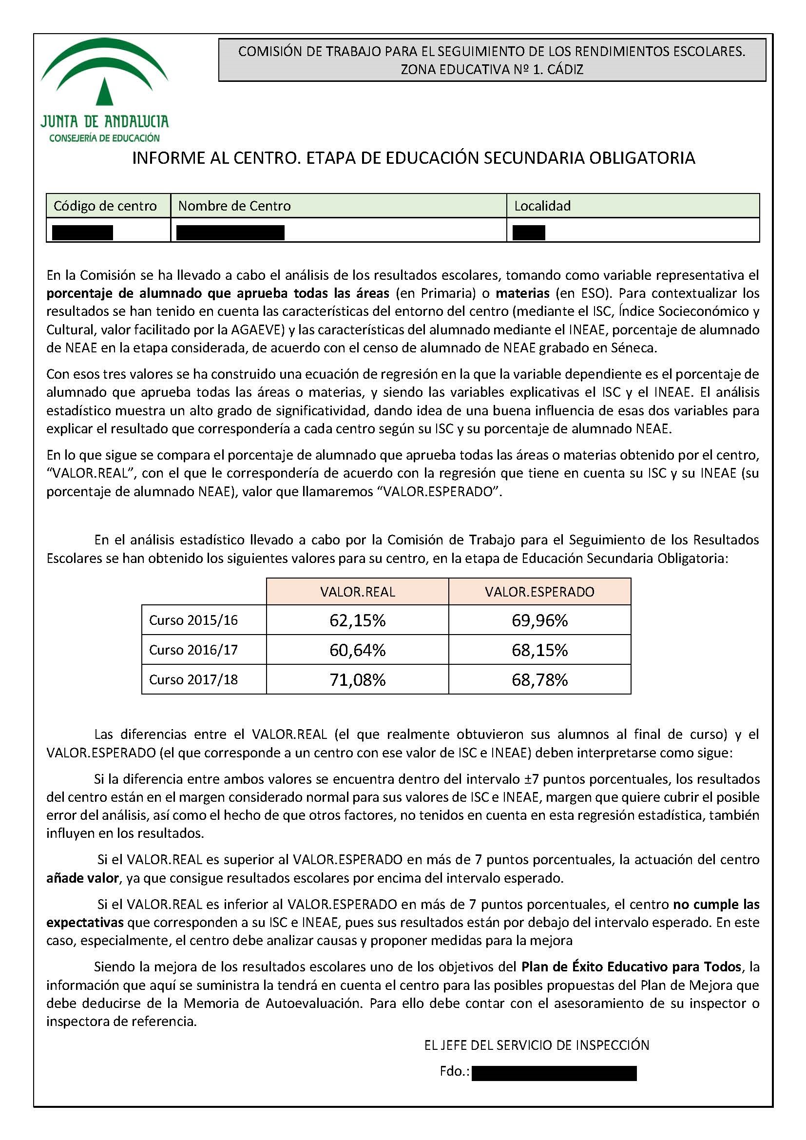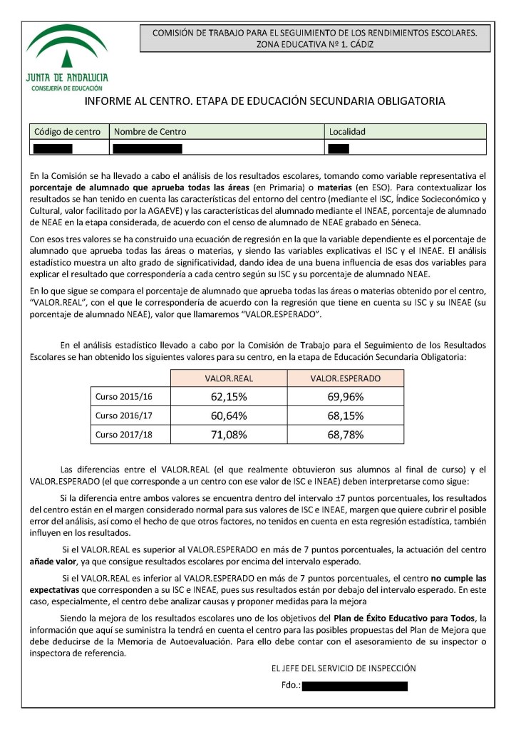 Pero como el análisis estadístico es de términos probabilísticos, hay que dejar un intervalo para margen de error. Ese intervalo lo hemos fijado en Cádiz en ±5 puntos porcentuales para Primaria y ±7 puntos porcentuales en ESO (en ESO los resultados reales presentan mayor desviación típica), de modo que el informe de resultados facilitado a cada centro, relativo a los tres últimos cursos: