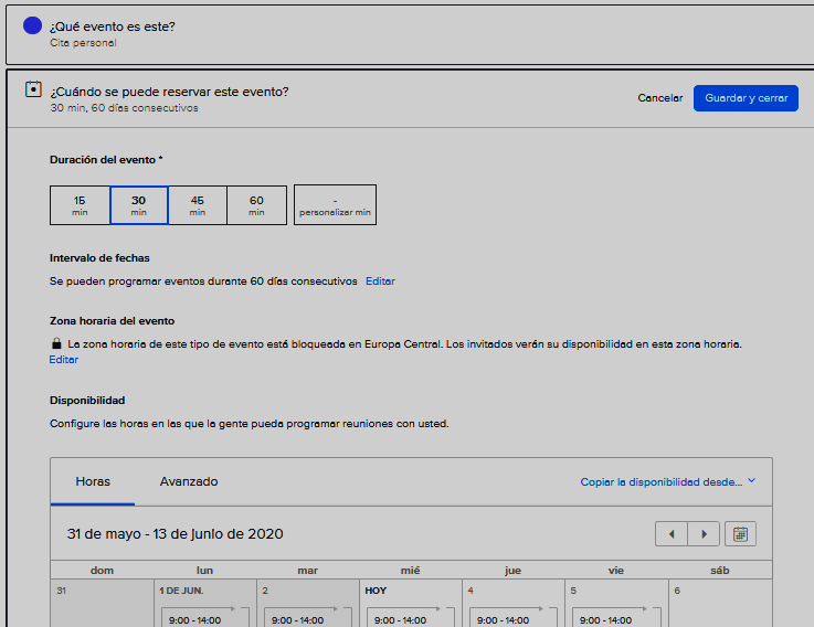 En el apartado “¿Cuándo se puede reservar este evento?”, podemos elegir la duración estimada de cada cita y en “disponibilidad”, fijar el horario durante el que se puede reservar.