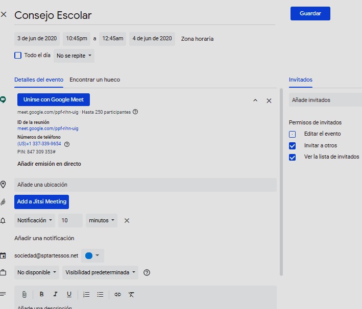 Al elaborar la entrada del calendario, una vez fijadas las fechas y horas de la sesión, nos encontramos con que podemos obtener el enlace para usar Google Meet, al que sólo tendremos que pulsar llegado el momento, para acceder a la sesión.