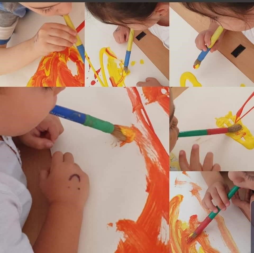 Es sencillo. Desinfectamos los pinceles, ponemos música que nos inspire y colocamos pintura indistintamente sobre papel continuo. Cada niño/a pone el pincel en su boca y adelante. De pronto los canales de comunicación y expresión se activan, los sentimientos afloran y aumenta de manera incipiente la creatividad de los genios y artistas que de manera innata llevamos dentro.