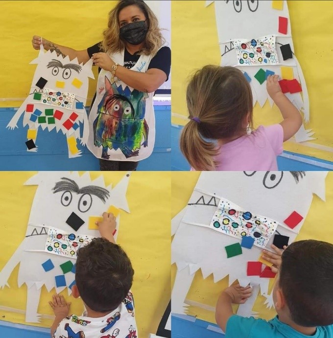 El monstruo también tiene sus miedos, sus angustias y a veces nos cuenta que está confundido, que está perdido y que la mascarilla le impide respirar, le pone triste; pero es su obligación llevarla para cuidar así de los demás. Los niños y niñas empatizan y expresan sus experiencias, sus ideas PRODUCIÉNDOSE un diálogo con ese personaje que enredado en sus emociones ha hecho que afloren las nuestras.