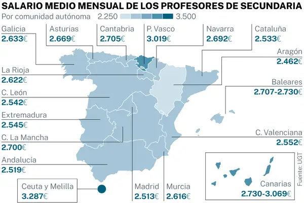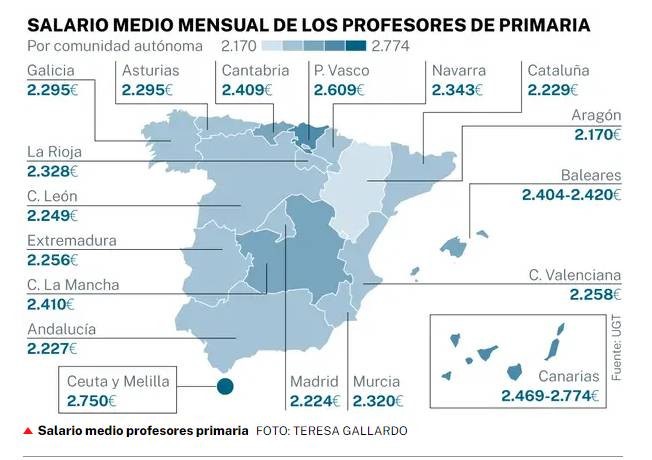 El informe ‘Retribuciones docentes en la Enseñanza Pública 2022′ de UGT refleja los distintos sueldos de los profesores en España según la comunidad autónoma en la que trabajen. En Educación Primaria, los salarios medios brutos oscilan entre los 2.609 euros al mes del País Vasco y los 2.170 de Aragón.