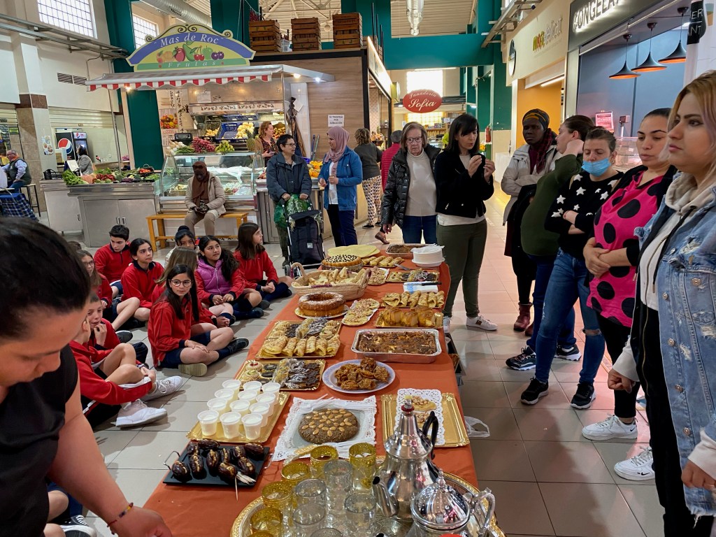 Pero no todos los servicios ofrecidos en esta segunda parte de “Dame la mano” fueron conjuntos. Ellas en solitario ofrecieron uno a la ciudad de Alcoy: el “Máster Chef” en el Mercado de San Roque. En él, ofrecieron un espectáculo culinario público donde cocinaron platos típicos originarios de sus países de origen: aghrir, msaman, salou, baklawa, zalija, sabli, chabakiya, blighat, bachnikha, khobz o imakla kika fueron algunos de los preparados marroquíes; Cuba estuvo representada con el pudín; Colombia con sus inconfundibles arepas; y España también lo hizo con un pastel de bacon y queso. Pero la jornada matutina no terminó con este espectáculo, ya que tras la degustación de los postres, llegó el turno de hacer la compra por el mercado con la ayuda de los escolares, concretando de manera real el taller del manejo de los euros realizado en el aula. Para ello, utilizaron unos tíckets especiales diseñados para la ocasión con un valor de 400 euros, cortesía del mismo Mercado de San Roque y del material solidario vendido por el alumnado.