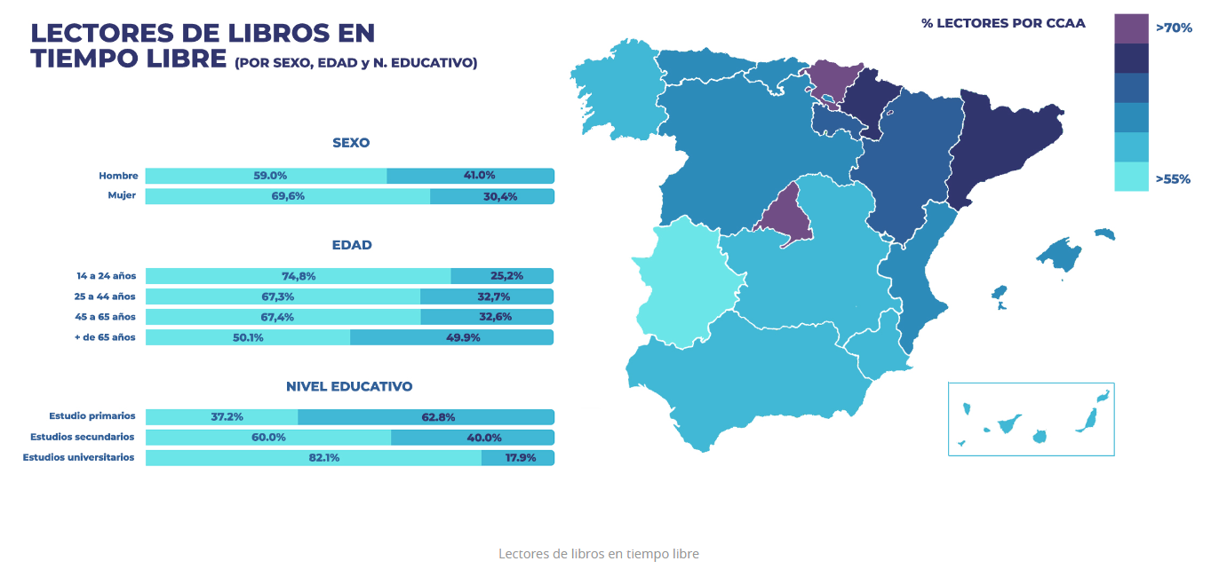 Respecto a la edad, el tramo con mayor población lectora es la comprendida entre los 14 y los 24 años (74,8% de población lectora en tiempo libre). A partir de los 25 años se produce una caída en los índices de lectura (67,3%) que se mantiene hasta el tramo de edad de más de 65 años en los que se observa una nueva caída (50,1% de la población es lectora).