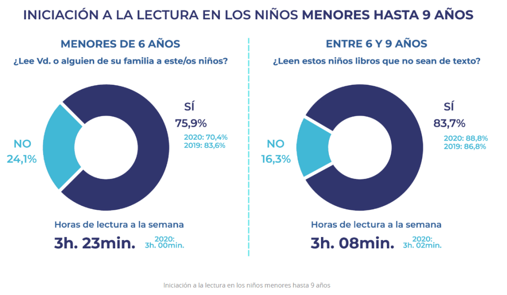 El Barómetro analiza la lectura entre los niños y adolescentes. La lectura infantil se mantiene en valores muy elevados. En el 75,9% de los hogares con niños menores de seis años se lee a los niños. Esta cifra supone 1,5 puntos porcentuales más que en 2020. En cuanto a los niños y niñas de 6 a 9 años, el 83,7% lee libros más allá de los libros de texto. Además, en ambos casos crecen las horas semanales dedicadas a la lectura.