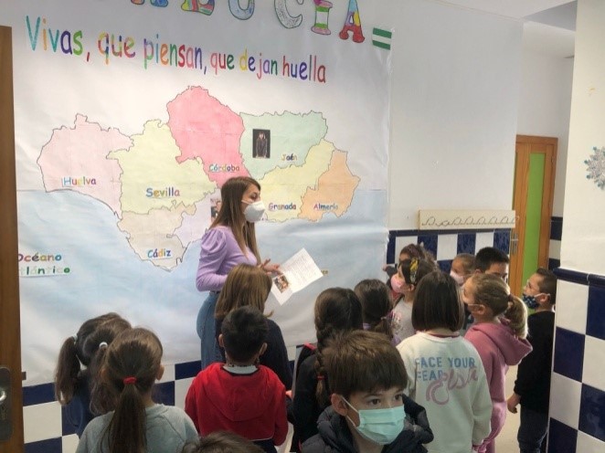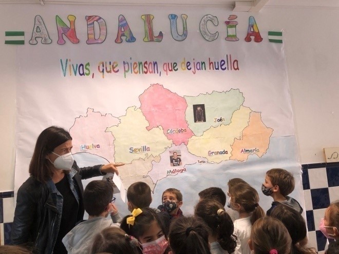 A partir de aquí, teníamos que encontrar un modo divertido de empezar el trabajo con nuestro alumnado ya que necesitábamos emocionarlos y motivarlos, para encender la chispa de la ilusión y conseguir que quisieran saber más sobre el trabajo en cuestión. Aquí el papel de las distintas actividades motivadoras en el proyecto para ir introduciendo a cada mujer era fundamental, ya que había que despertar el interés y llamar la curiosidad de nuestras niñas y niños sobre algo novedoso. Mora (2019) explica que el ser humano es curioso por naturaleza, lo que nos invita a explorarlo e inspeccionarlo todo y que cuando encontramos algo que sobresale se activan las mismas neuronas que responden al placer. Y eso fue lo que hicimos, invitamos a nuestras niñas y niños a despertar su curiosidad, para ello, aprovechamos las actividades celebradas en febrero sobre el día de Andalucía para colocar un enorme mapa mudo de Andalucía en el pasillo. Esto dio lugar a que nuestro alumnado formulara preguntas como: ¿por qué el mapa está vacío?, ¿por qué está ese mapa ahí? o ¡qué dibujo más bonito!