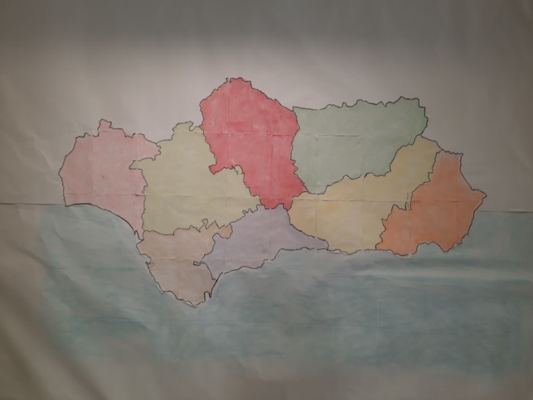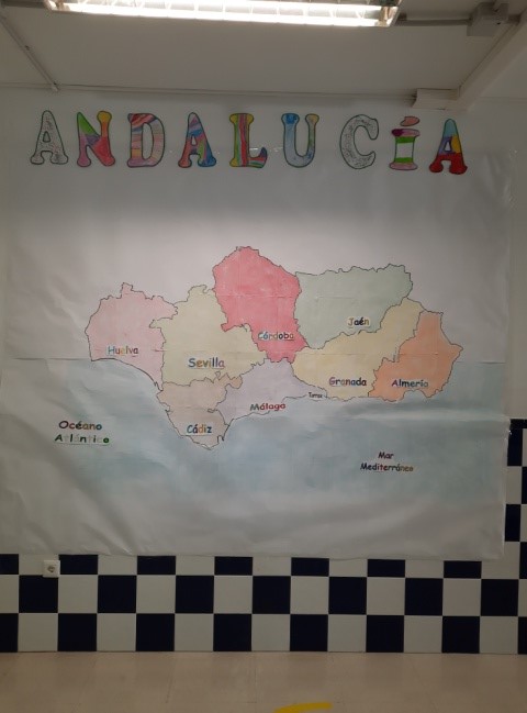 A medida que pasaron los días en la semana de Andalucía, íbamos poniendo en el mapa el nombre de las provincias, por lo que cada día aparecía una provincia y esto les llamaba a nuestro alumnado mucho la atención. Cuando nos íbamos de Semana Blanca, el mapa estaba con las ocho provincias y el título de Andalucía.