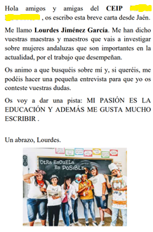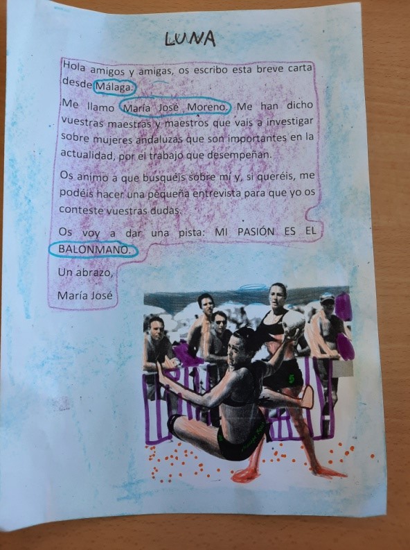 y una foto. En primero de primaria recibieron una carta de Lourdes Jiménez, maestra y mejor docente en el año 2019 y en segundo una carta de María José Moreno, ex jugadora y actual presidenta del Club Balonmano Femenino Málaga Costa del Sol.