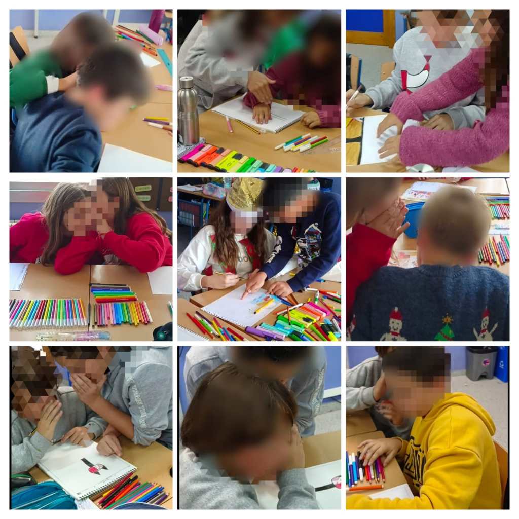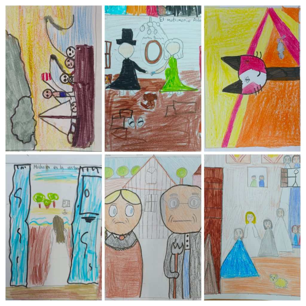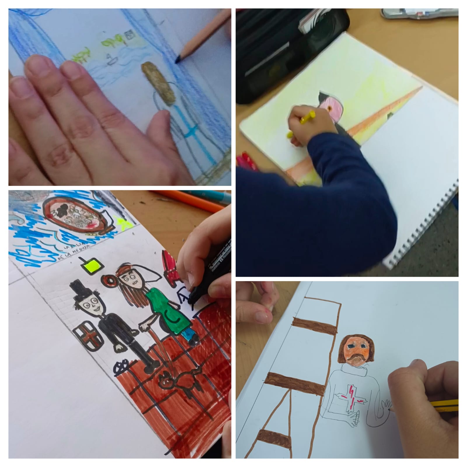 Porque, por un lado, los dictados visualistas desarrollan en el alumnado una herramienta esencial, tanto para las expresiones escritas y orales como para la comprensión e incluso las futuras técnicas de estudio: la capacidad de organizar la información. A la vista está, que las primeras veces, se les acababa el tiempo, sonaba la alarma y muchos no solo no habían terminado, sino que les faltaban elementos principales del cuadro. Y poco a poco, ayudando a los visualistas los primeros minutos de juego, y con su propia experiencia, han aprendido la importancia de estructurar la información. Comenzar por darle una dirección a todo, si vertical u horizontal. Situar los objetos y personajes principales en el espacio, sin perfilar siquiera. Solo el tamaño aproximado de lo que luego ya se perfeccionará. Partir de elementos centrales y luego ir rellenando de manera simétrica. O los hay que prefieren de arriba a abajo. Y ya el abanico de detalles, colores, texturas, expresiones…