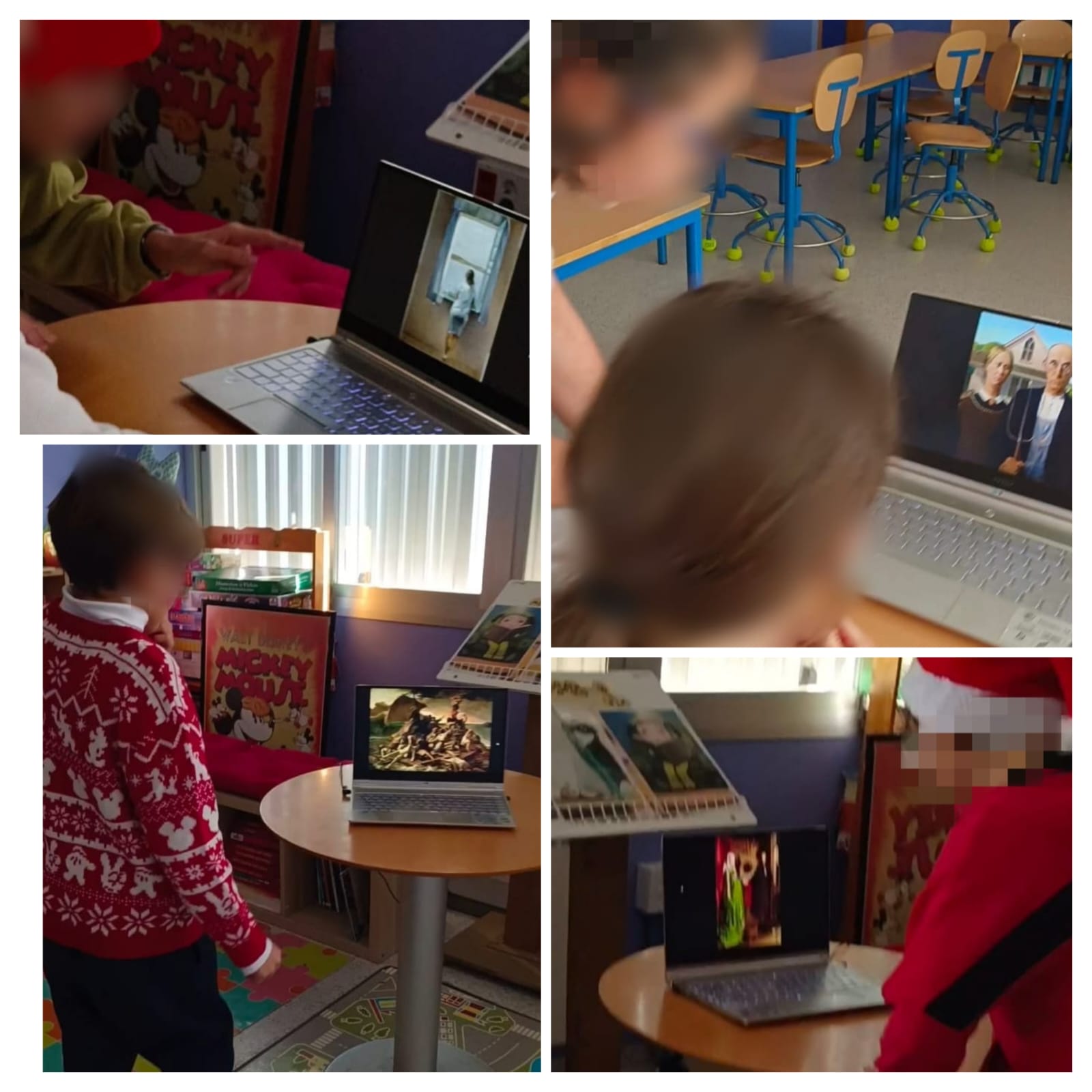 La función del visualista es clara. Ir de la Zona de Museo (cuadro) al aula (grupo) para ir describiéndoles progresivamente lo que deben pintar en sus blocs. Ya está.