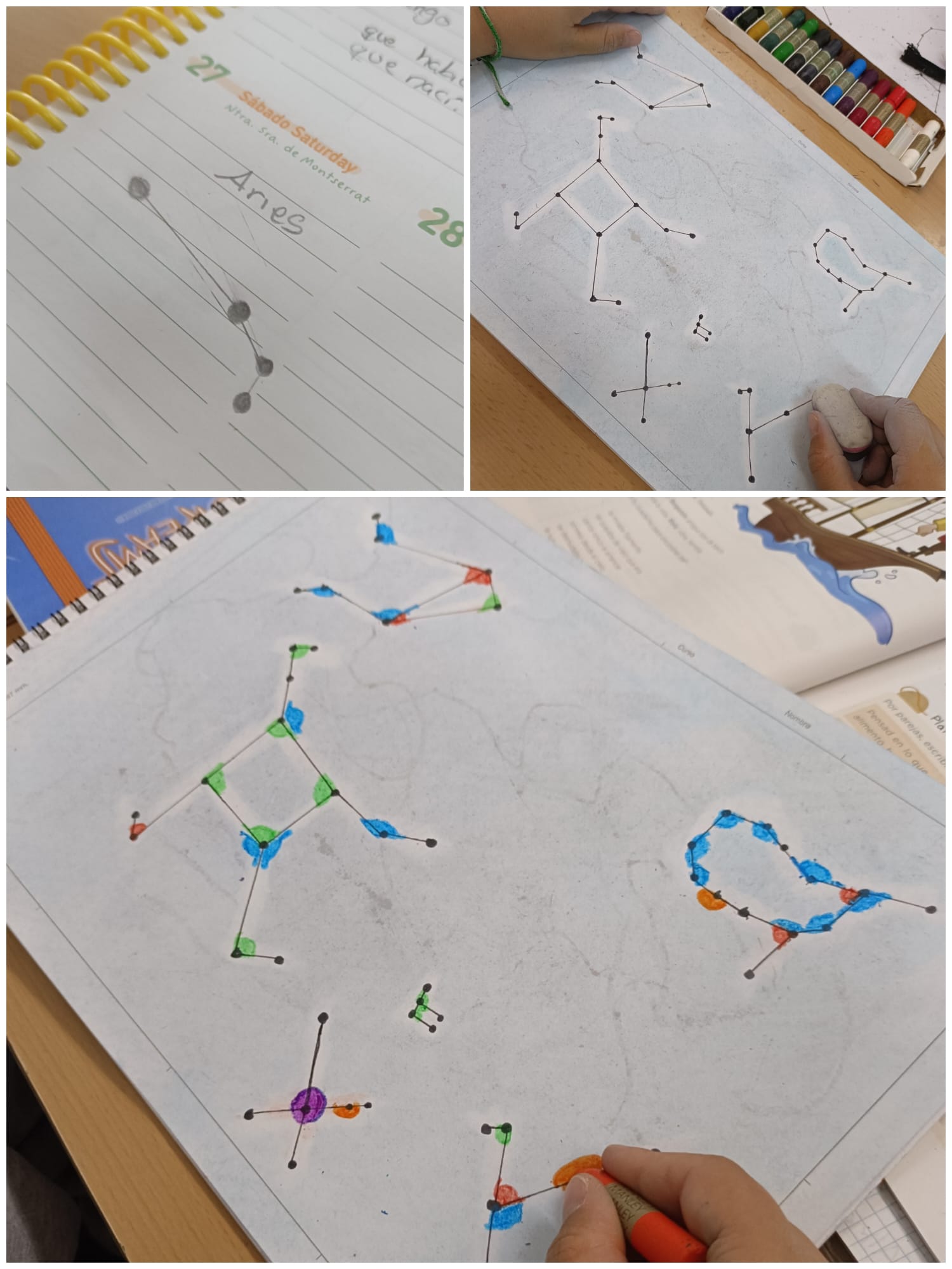 Al llegar a clase, yo les había dejado preparado un gran mural de papel continuo negro, con los elementos del Sistema Solar a modo de planetario, pero con un enorme hueco vacío para rellenar. La idea era que, por turnos, fueran pasando por el mural de la clase para ir pintando sus constelaciones, unas al lado de otras, a modo de composición. ¿El resultado final? Un cielo nocturno único seguramente irrepetible. Porque era nuestro conjunto de constelaciones, de esa clase, de esas 25 fechas de nacimiento en concreto. Un mural único en todo el universo. ¡Chulísimo!