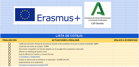 Junto a estos documentos, se facilita una «Lista de cotejo de actuaciones posteriores a la movilidad». Esta herramienta abarca una serie de tareas a realizar por cada participante, que van desde la subida de los certificados recibidos al repositorio Drive personalizado, hasta la elaboración de un documento con la información recopilada durante la movilidad. Igualmente incluye enlaces a evidencias de difusión en espacios virtuales, actas de difusión en Claustro y Consejo Escolar, evidencias de implementación en el aula o centro, el CV Europass y un formulario de evaluación de la gestión de la movilidad por parte del centro coordinador. Este último recurso, permite valorar el proceso desarrollado y consecución de los objetivos propuestos, así como elaborar propuestas de mejora para futuras actuaciones.