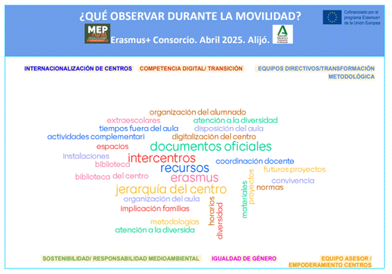 Otro recurso fundamental en esta carpeta ( Durante la movilidad) es la «Lluvia de ideas: ¿Qué observar durante la movilidad?», una guía de conceptos clave para las estancias de observación en los centros de acogida. Esta herramienta ayuda a los participantes a recordar puntos de interés relevantes, como son los sistemas de organización, coordinación docente, procesos de digitalización; que a veces pueden pasar desapercibidos en las nuevas vivencias, pero que son esenciales para la mejora de la práctica educativa.