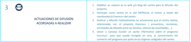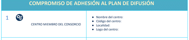 - Plan de difusión y compromisos: Se entrega el plan de difusión y los compromisos adquiridos por el centro educativo del participante, en esta materia.Cada centro participante dispone de un documento de adhesión al plan de difusión establecido por el centro coordinador del consorcio, lo que facilita la coordinación de las acciones a desarrollar y garantiza que las actuaciones son unificadas.