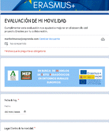 - Diario de mi movilidad: Se trata de un formulario Google diseñado para ser cumplimentado diariamente por el participante. Esta herramienta permite registrar las impresiones más relevantes de la experiencia Erasmus+ al final de cada jornada, facilitando la posterior recopilación de datos y difusión de las vivencias al regresar de la movilidad. Incluye preguntas sobre personas entrevistadas, grupos o clases observadas, aprendizajes adquiridos, posibles implementaciones en el aula o grupo, y recordatorios de actuaciones importantes. Al permitir el envío de una copia al participante y al coordinador del Consorcio, se posibilita una monitorización en vivo de la movilidad.